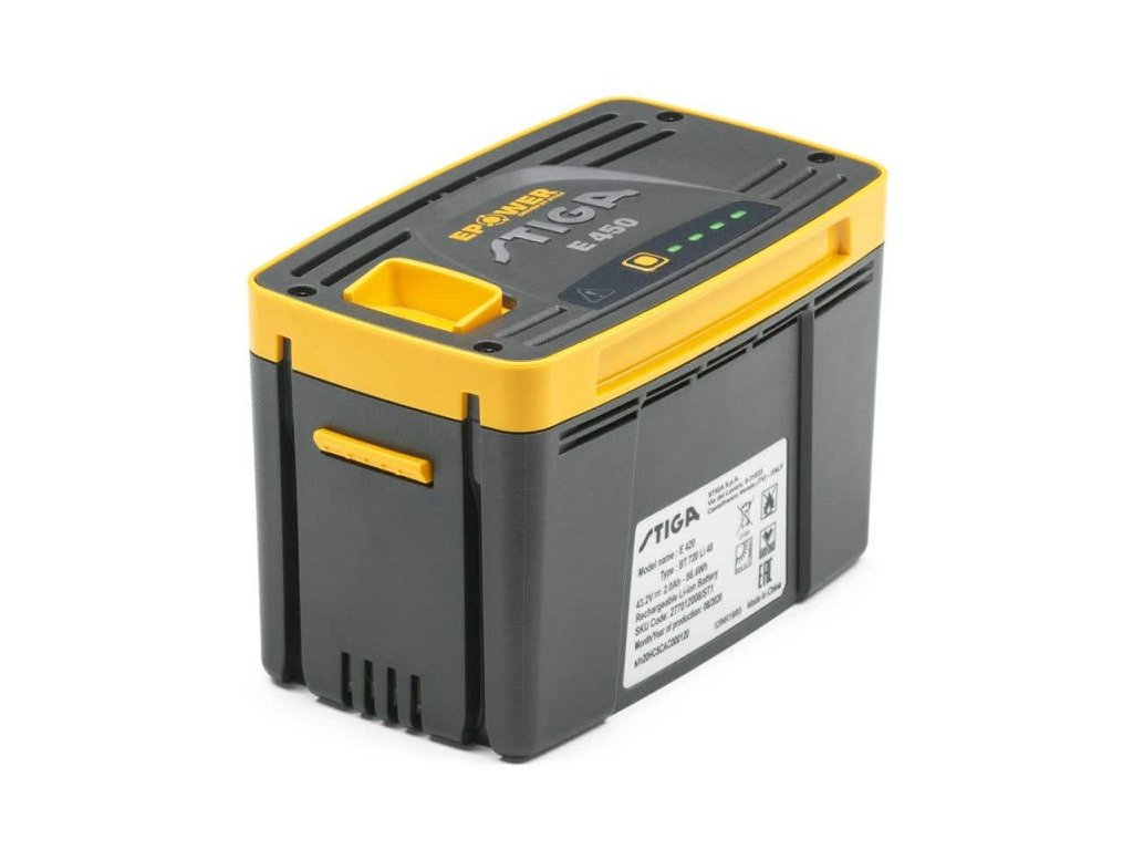 Baterie E 450, vhodná pro sekačky a nástroje řady STIGA 500, 700 a 900. KAPACITA 5AH BATERIE STIGA E-POWER STANDARDNÍ NABÍJECÍ ČAS 220 MINUT VHODNÁ PRO SEKAČKY A NÁSTROJE ŘADY STIGA 500, 700 A 900. E 440 baterie s kapacitou 4 Ah vhodné pro všechny sekačky a nářadí řady STIGA 500, 700 a 900.Doplňkové parametry