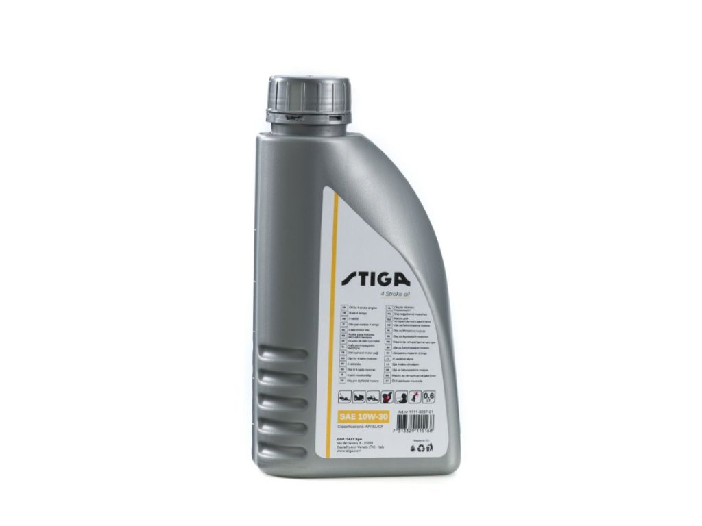 SAE 10W-30 je čtyřtaktní multifunkční olej. "10W" označuje viskozitu oleje při nízkých teplotách a číslo 30 udává viskozitu při 100 ° C: to znamená, že SAE 10W-30 zaručuje vysoký výkon mezi -15 ° a + 40 °. Lahvička obsahuje 0,6 litru produktu. Tento olej byl speciálně navržen pro motory na strojích STIGA a jeho použití se doporučuje za účelem dosažení lepšího výkonu, zvýšení spolehlivosti a delší životnosti motoru. 4-taktní olej především zabraňuje opotřebení kovových povrchů motoru, což vytváří film, který je odděluje. Dále rozptýlí teplo a snižuje opotřebení a působí jako ochrana motoru. Dobrý olej zabraňuje hromadění nečistot a usazenin, chrání kovové části. Olej odpovídá klasifikaci SL/CF a viskozitní třídě SAE 10W30 podle normy API.Doplňkové parametry