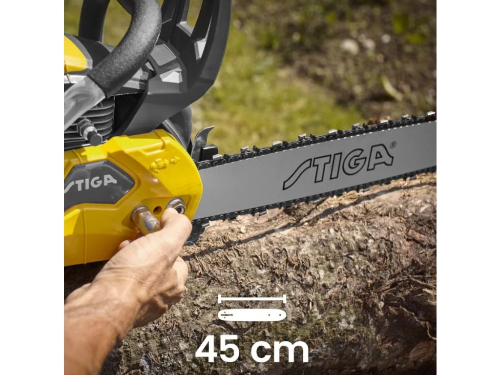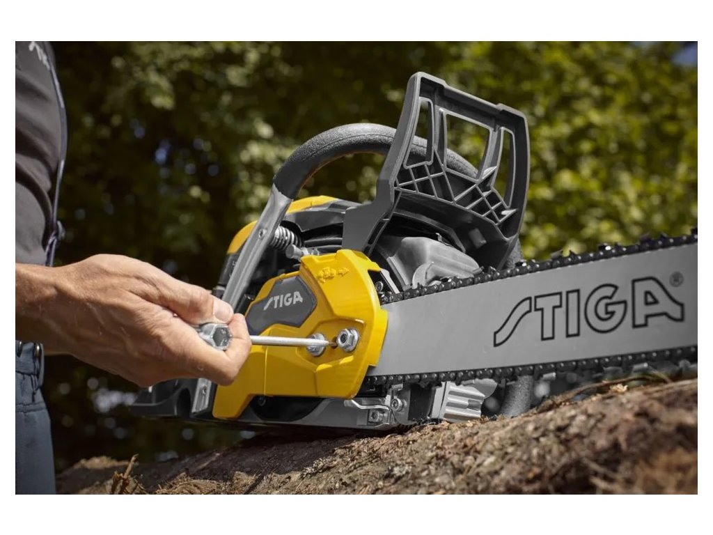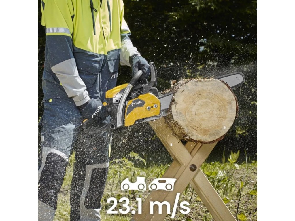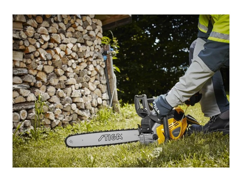 Spolehlivá benzínová řetězová pila STIGA CS 755 (18")má dobrý poměr hmotnosti a výkonu, 45cm (18") vodící lištu a díky tomu je vhodná pro domácí i lesnické práce. Zážehový motor o obsahu 52 cm3 (2,5 kW) je doplněn hořčíkovým krytem motoru, který zajišťuje pevnost, spolehlivost a rychlé chlazení. Dekompresní ventil umožňuje snadné startování, olejové čerpadlo je automatické a nastavitelné. Úkony údržby lze provádět rychle a snadno díky řadě funkcí, jako je demontování krytu vzduchového filtru bez potřeby dalších nástrojů, napínací klíč umístění pod zadní rukojetí a monitorovací okénko hladiny palivové nádrže. Ergonomická měkká rukojeť a pružinový systém zajišťují menší vibrace a vyšší pohodlí.