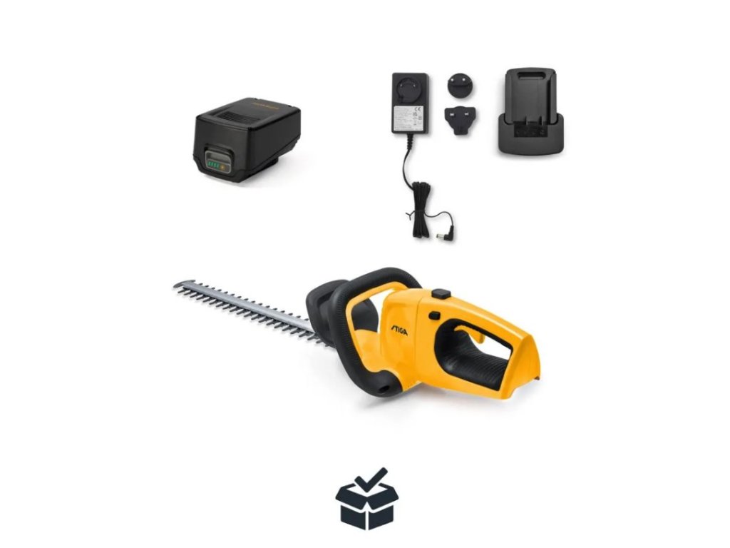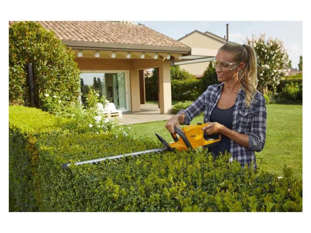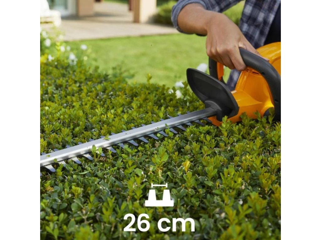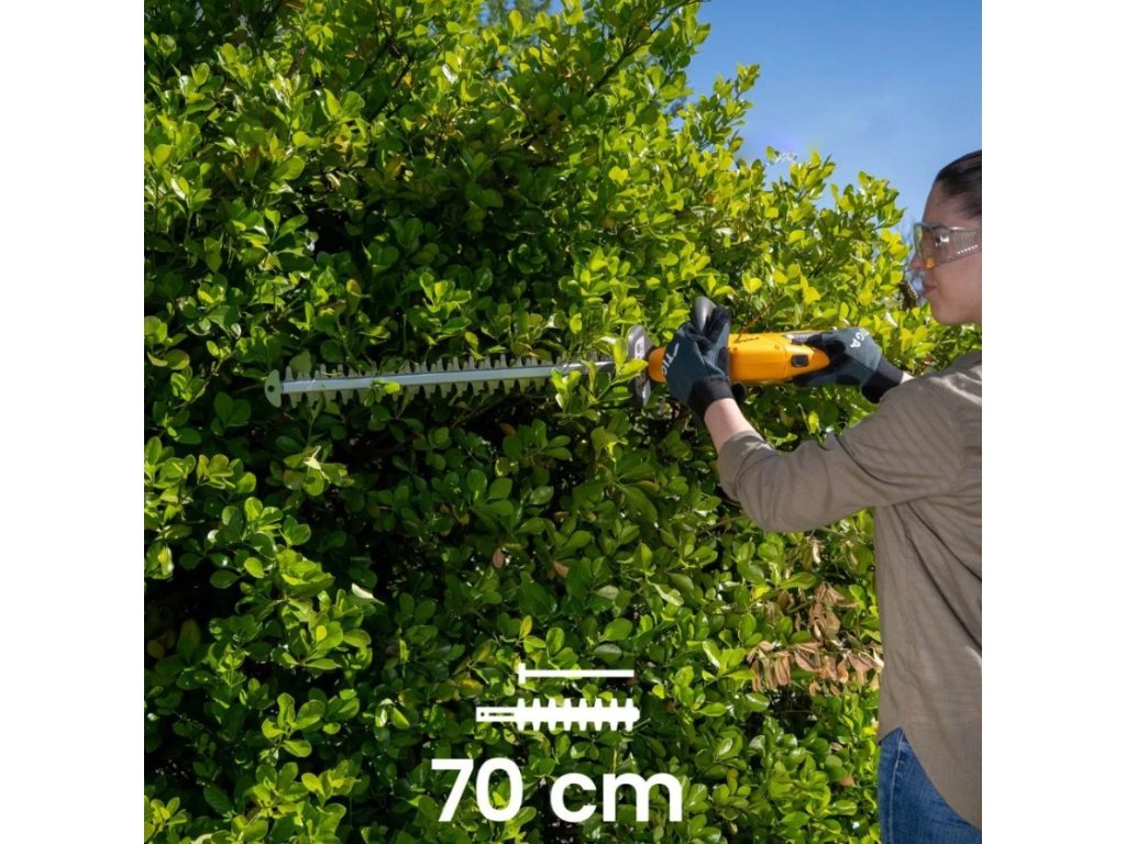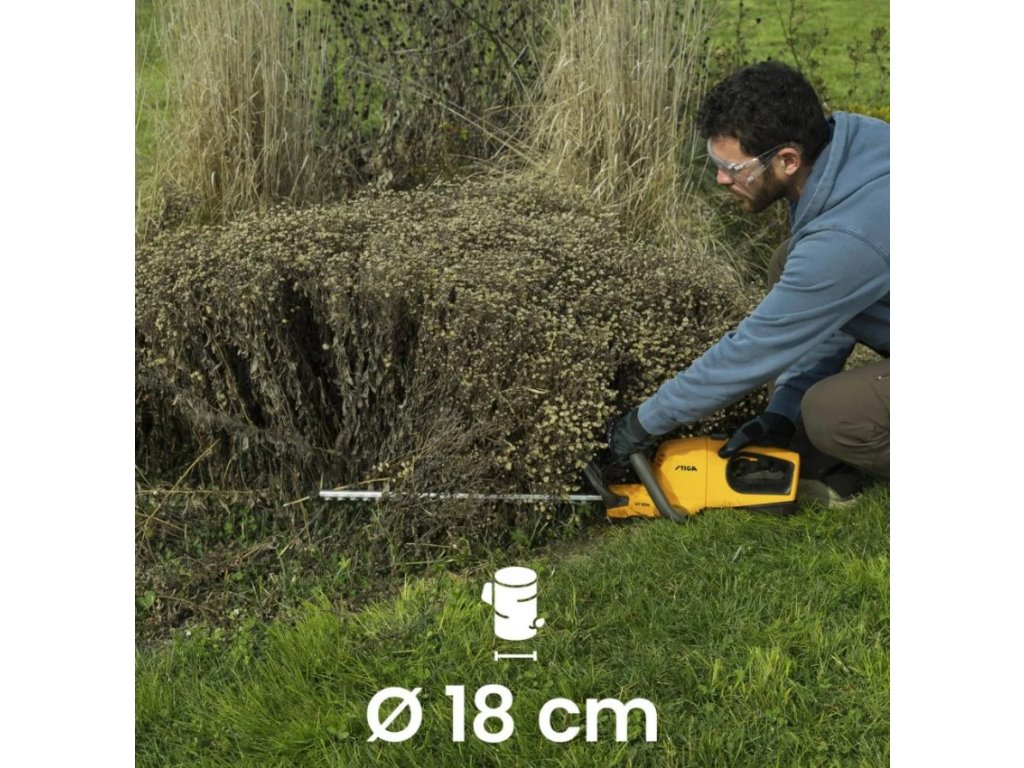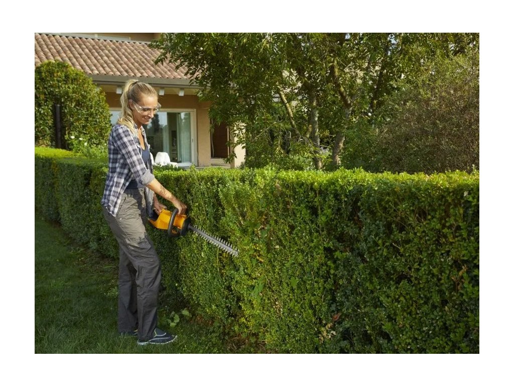 HT 100e Kit je akumulátorový plotostřih, který usnadňuje práci při náročných zahradnických úkolech. Pohodlně a bez přívodního kabelu můžete nechat 55 cm dlouhou dvojčinnou čepel z kalené oceli stříhat živé ploty a keře. 20V baterie poskytuje na jedno nabití až 40 minut pracovního času a činí stroj tišším než jakýkoliv typický benzínový plotostřih. Díky 18mm mezeře mezi zuby, čepel snadno přestřihne i středně silné větve. Pro větší pohodlí je tento akumulátorový plotostřih vybaven nastavitelnou rukojetí s měkkým polstrem otočnou o 180 °. A s dvojitým spínačem budete mít stroj vždy pod kontrolu. Integrovaná ochrana hrotu čepele zabraňuje poškrábání stěn či plotu. Na zadní části najdete pohodlný závěsný otvor za, který můžete plotostřih bezpečně pověsit a tím uskladnit.