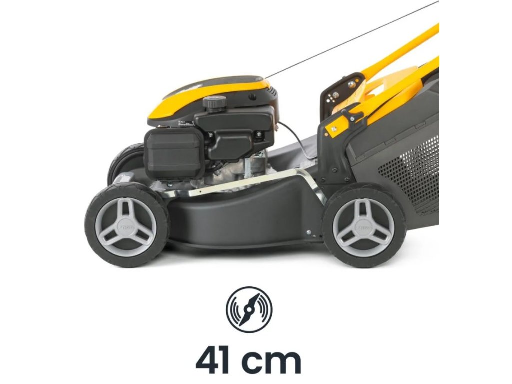 41cm ocelové žací ústrojí nabízí šest centrálních poloh nastavení výšky sečení (22–65 mm) a možnost zadního výhozu, což zajišťuje přesné a flexibilní sečení menších až středně velkých trávníků.