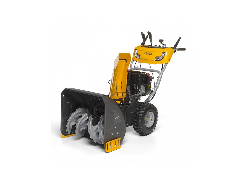 STIGA ST 966 je dvoustupňová sněhová fréza s pracovním záběrem až 66 cm a 16” velkými sněhovými koly navržená tak, aby odklízela i ty nejnáročnější vrstvy sněhu. Hydrostatická převodovka Hydrogear SST vám poskytuje extra pohodlné ovládání. Model je poháněn silným benzínovým motorem STIGA WS 300 o objemu 302 ccm. Všechny ovládací prvky jsou pohodlně umístěny na středovém panelu. Komfortní elektrické startování vám umožní nastartovat při jakékoli teplotě až do -30 °C. Díky vyhřívanému madlu, které se aktivuje tlačítkem na palubní desce, vám ST 966 umožní provádět nepřetržitou práci i při velmi nízkých teplotách. Díky inovovanému systému a výkonnému ocelovému šneku s pilovými zuby dokáže vyhazovat sníh do vzdálenosti až 15 metrů. Viditelnost je zajištěna výkonným a nastavitelným LED světlem, díky němuž lze pracovat i ve zhoršených světelných podmínkách.Doplňkové parametry